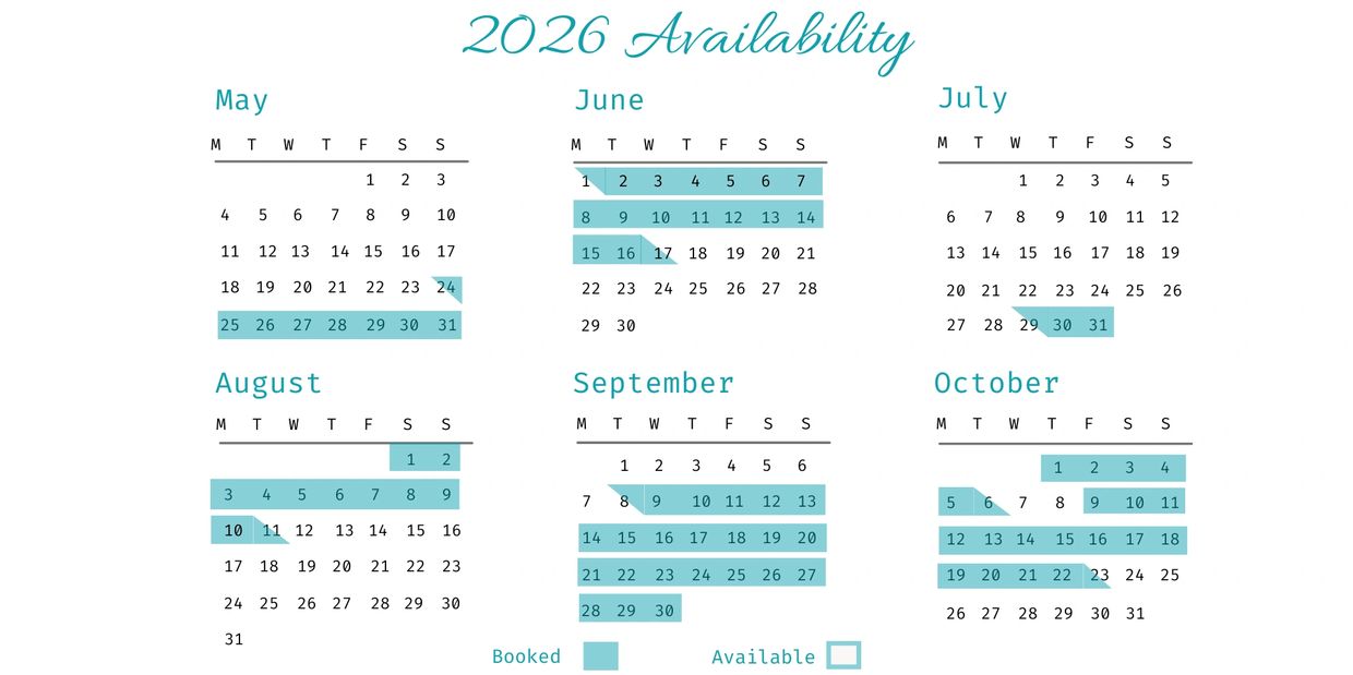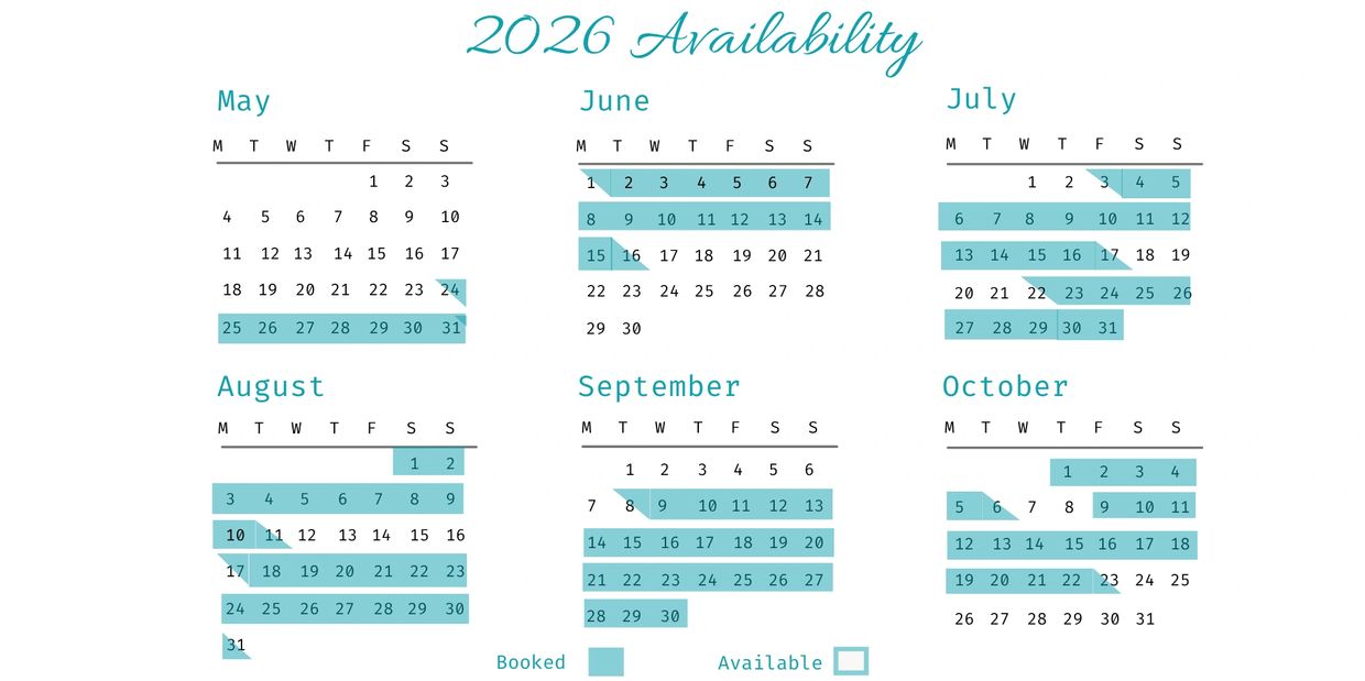 Our calendar is kept fully up-to-date and shows current availability for 2026.